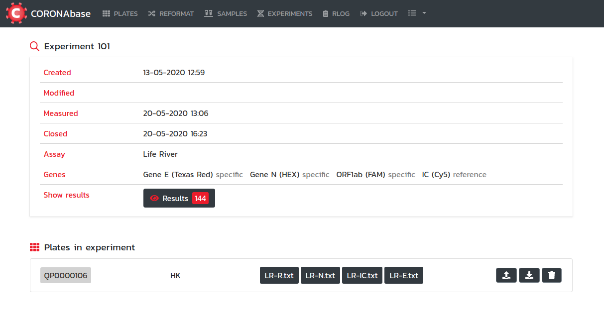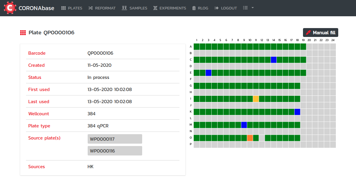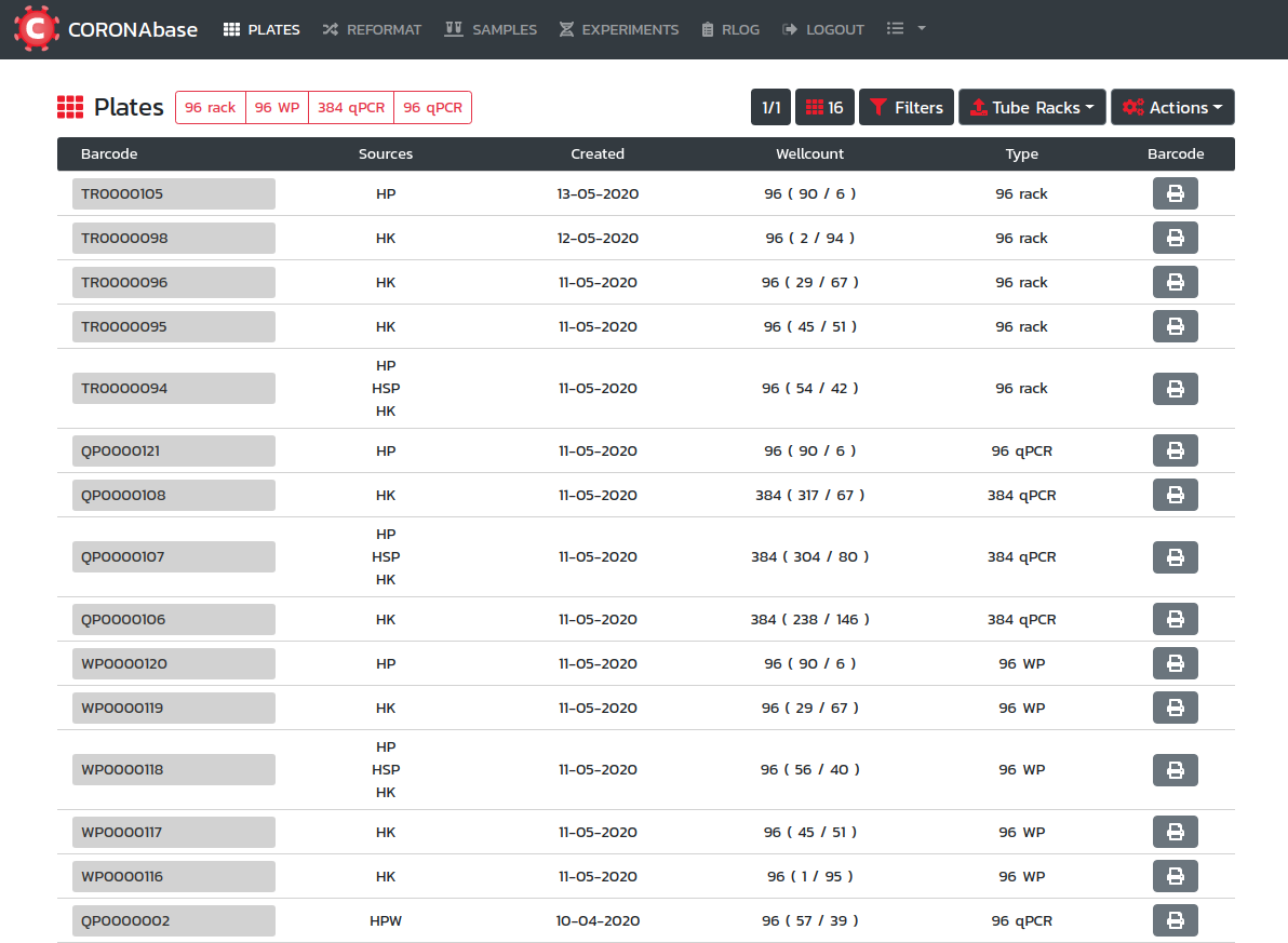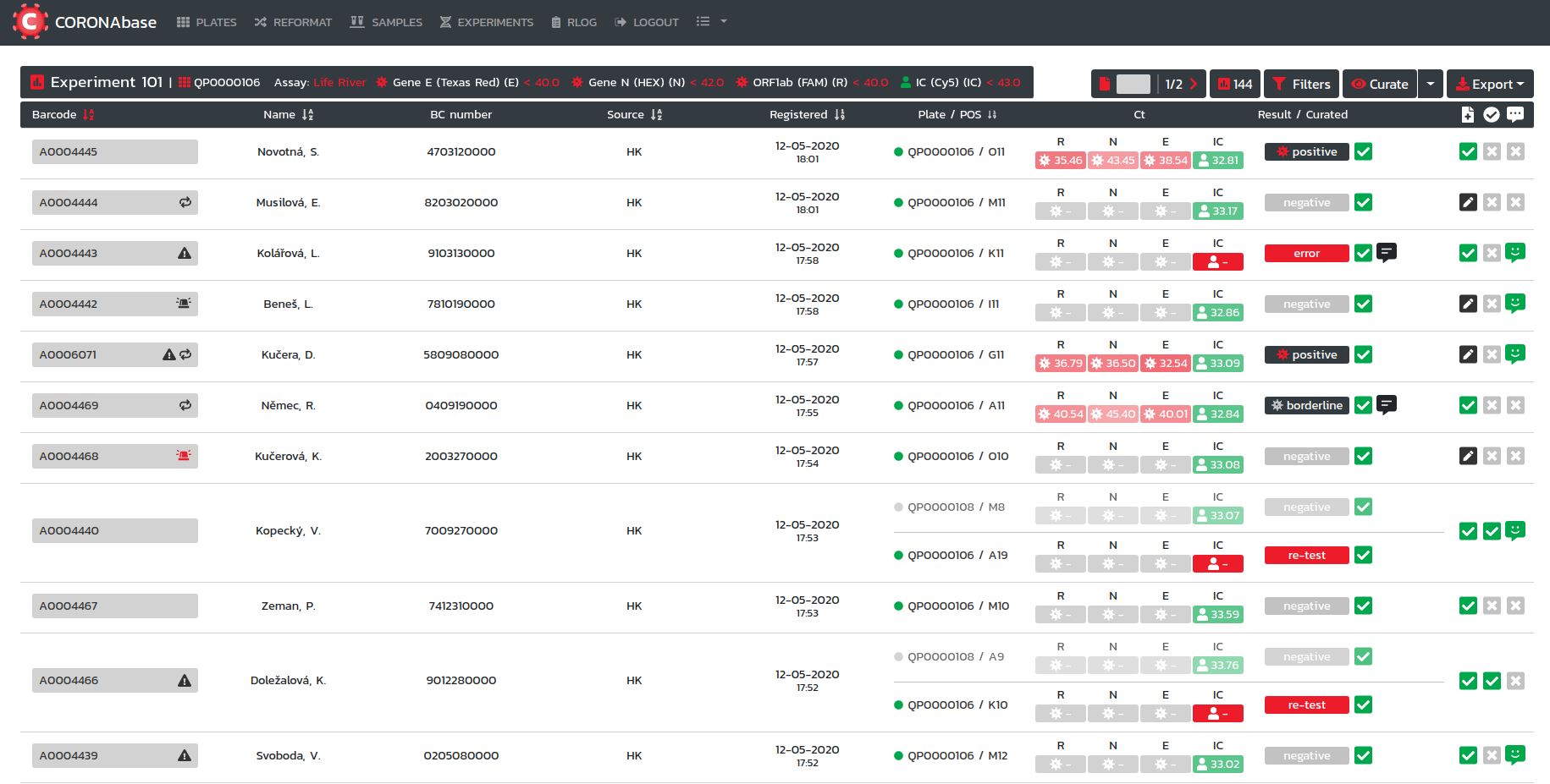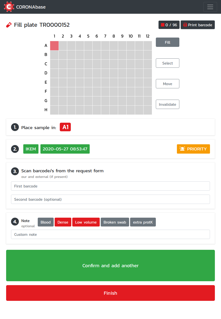 Efficient tracking of patient samples. CORONAbase allows to efficiently track patient samples throughout the whole testing process: from sample registration through RNA isolation and qPCR detection, to the final quality control and data reporting. Individual samples are labelled with barcodes that serve as unique identifiers and the application can be adjusted to different workflows based on individual test tubes or multiwell plates. Finally, the interactive plate view gives a visual overview of the occupancy and consistently color coded sample priorities.