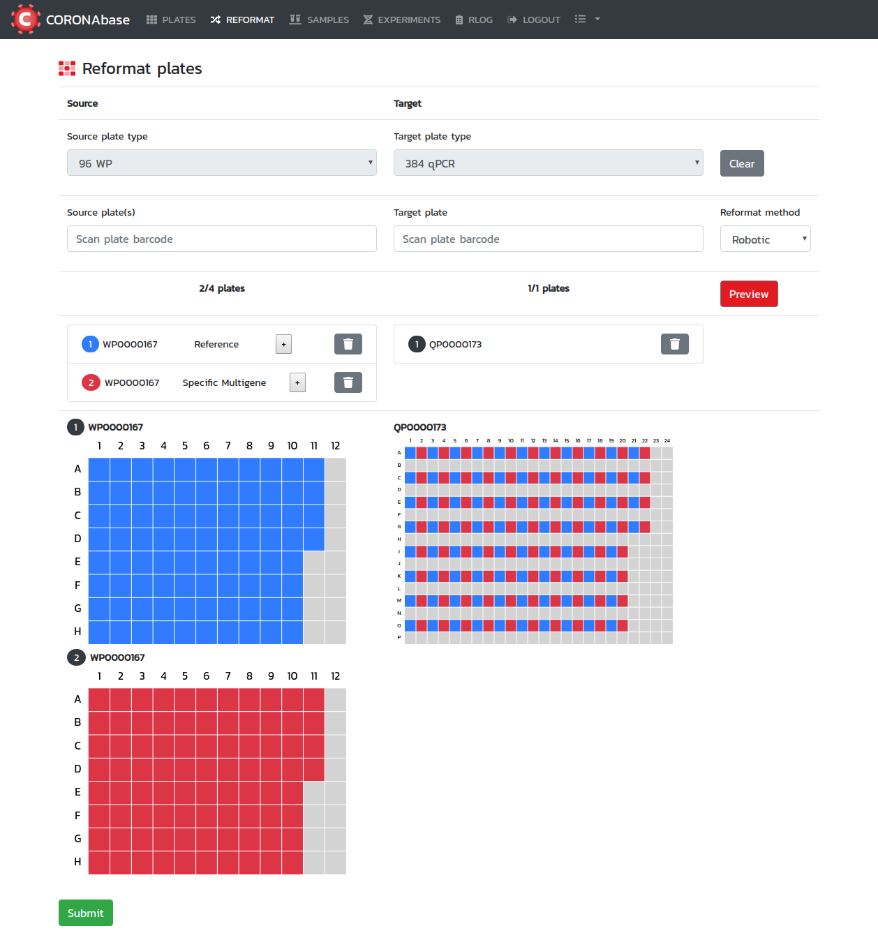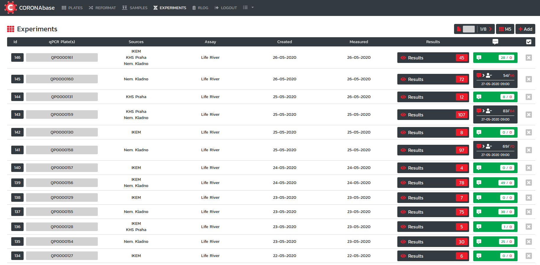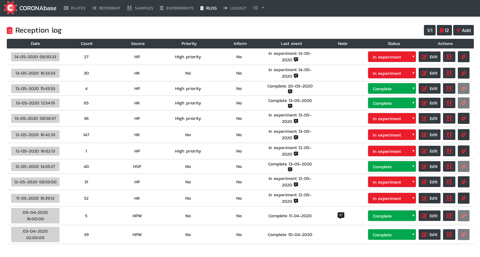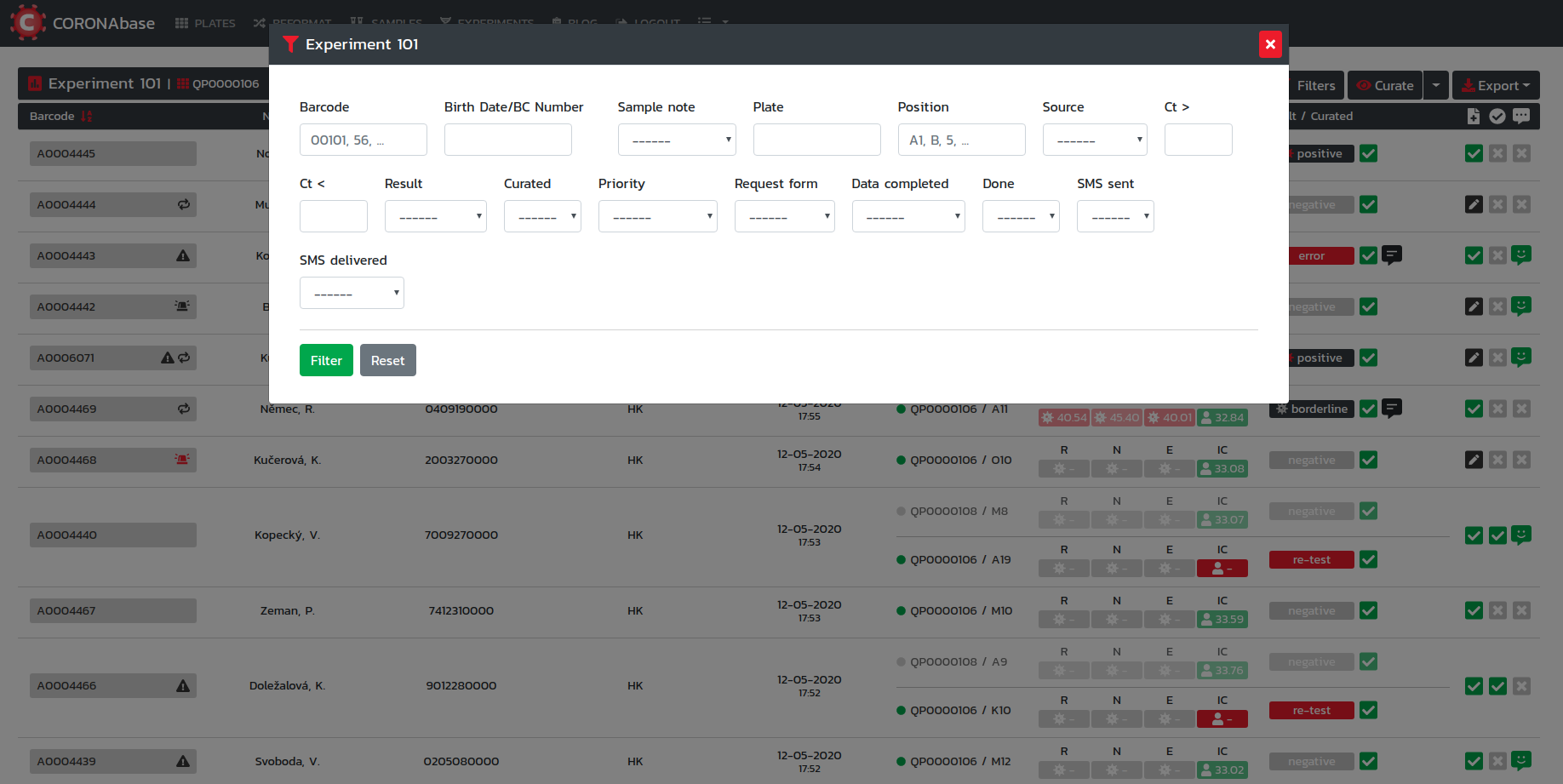 Efficient tracking of patient samples. CORONAbase allows to efficiently track patient samples throughout the whole testing process: from sample registration through RNA isolation and qPCR detection, to the final quality control and data reporting. Individual samples are labelled with barcodes that serve as unique identifiers and the application can be adjusted to different workflows based on individual test tubes or multiwell plates. Finally, the interactive plate view gives a visual overview of the occupancy and consistently color coded sample priorities.