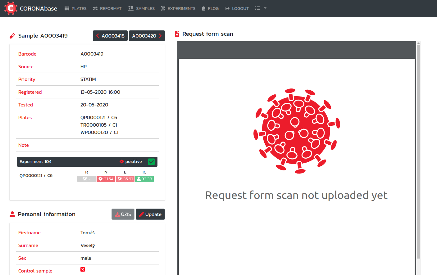 CORONAbase is a comprehensive, cross-platform database for PCR diagnostics, which has been developed and employed at the Institute of Molecular Genetics, Prague, during the COVID-19 pandemic to keep the testing records organized. The main features of the application are: