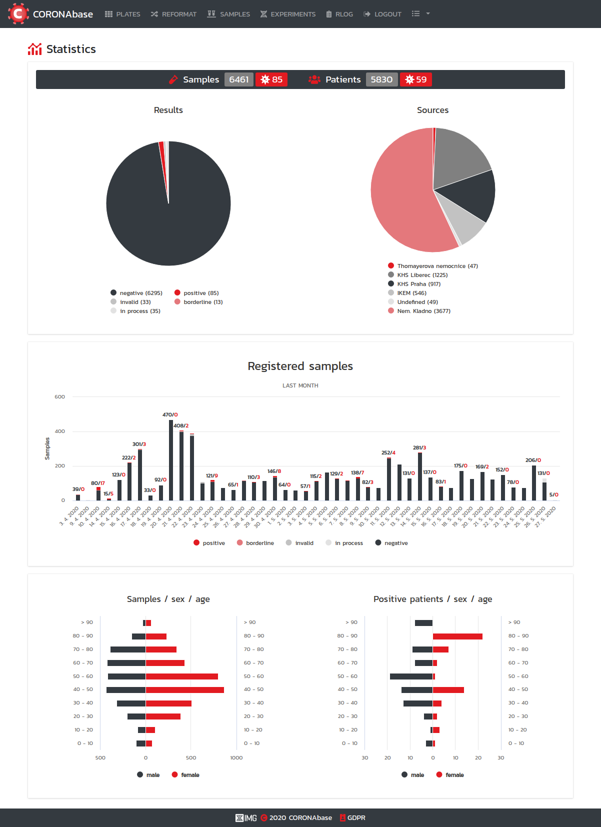 Intuitive data visualization. The Statistics provides a comprehensive overview of total sample numbers and positive test results based on various demographic parameters and sample sources, as well as daily statistics for the number of registered, processed and positive samples.